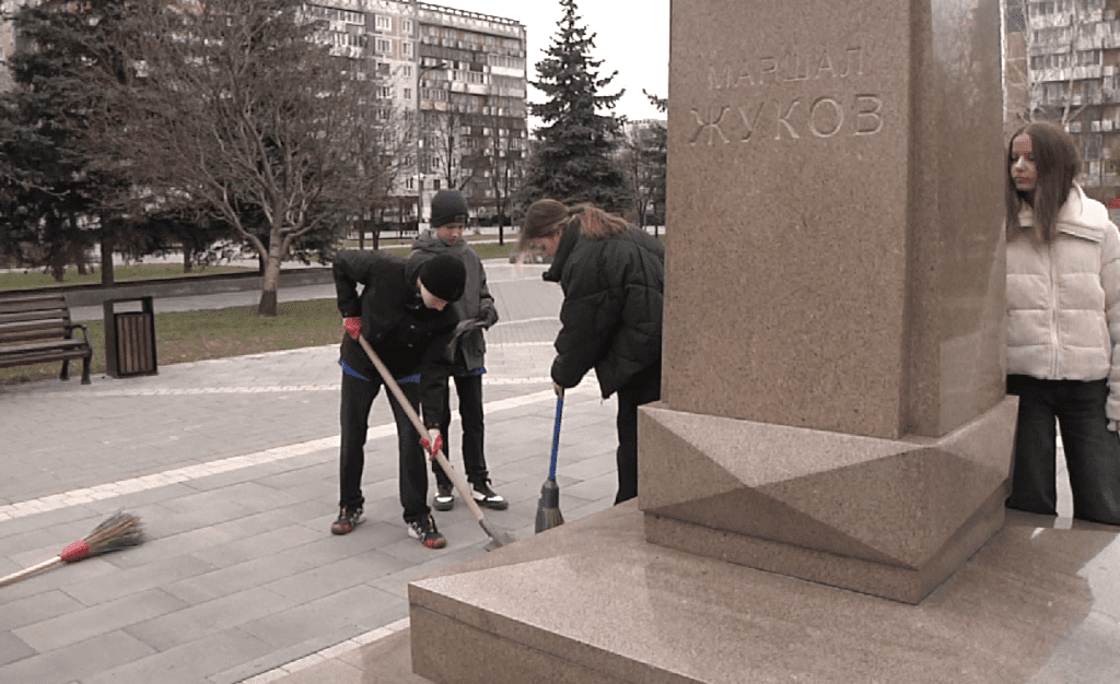 В сквер имени маршала Жукова и на Бульвар Героев вышли юные новокузнечане. Школа №67 помимо уборки своей территории несет своего рода шефство над бюстом Георгия Жукова. Зимой памятник очищают от снега и вокруг чистят площадку, а теперь подметают и протирают гранит.