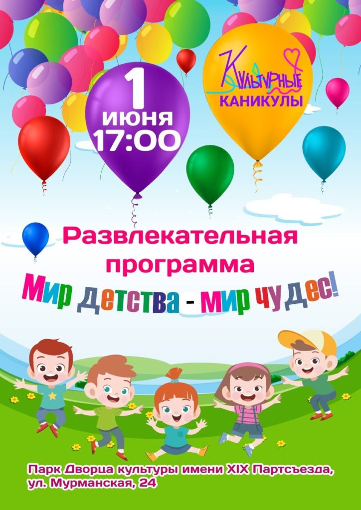 Культурно-досуговый комплекс Орджоникидзевского района на Мурманской, 24 «ДК имени 19-го Партсъезда» зовет детей на праздник в парк «Мир детства – мир чудес». Начало запланировано на 17:00.