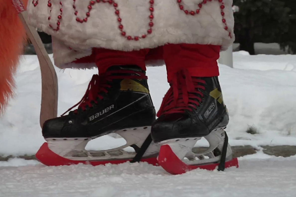 А в поддержку новокузнецкого хоккея один из Дедов Морозов прошел весь парад на коньках , а вместо волшебного посоха у него была клюшка.