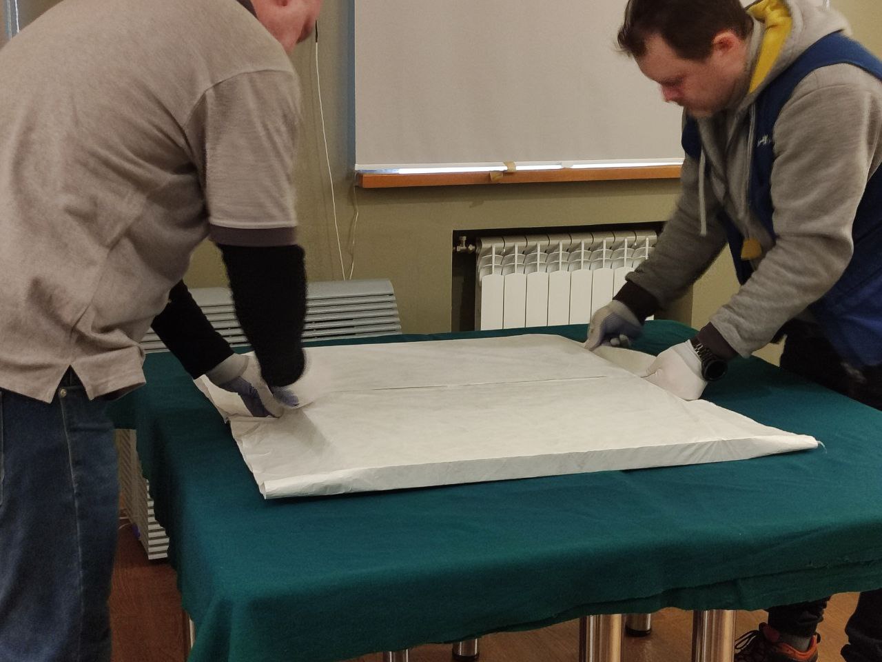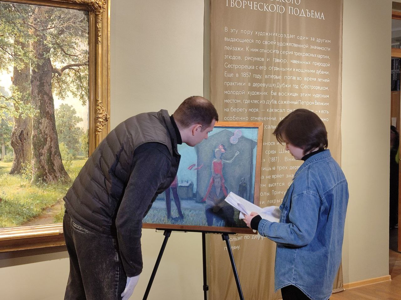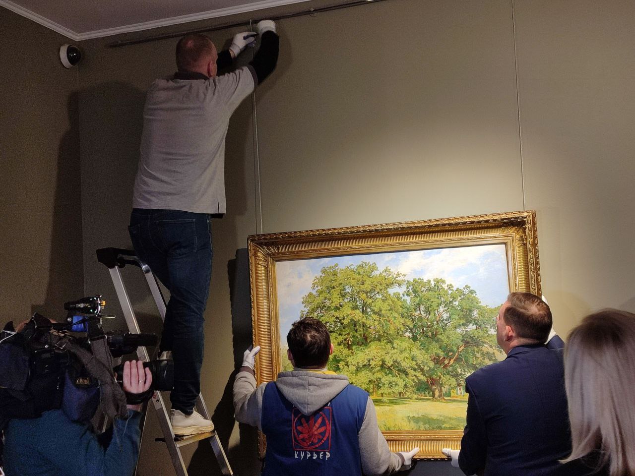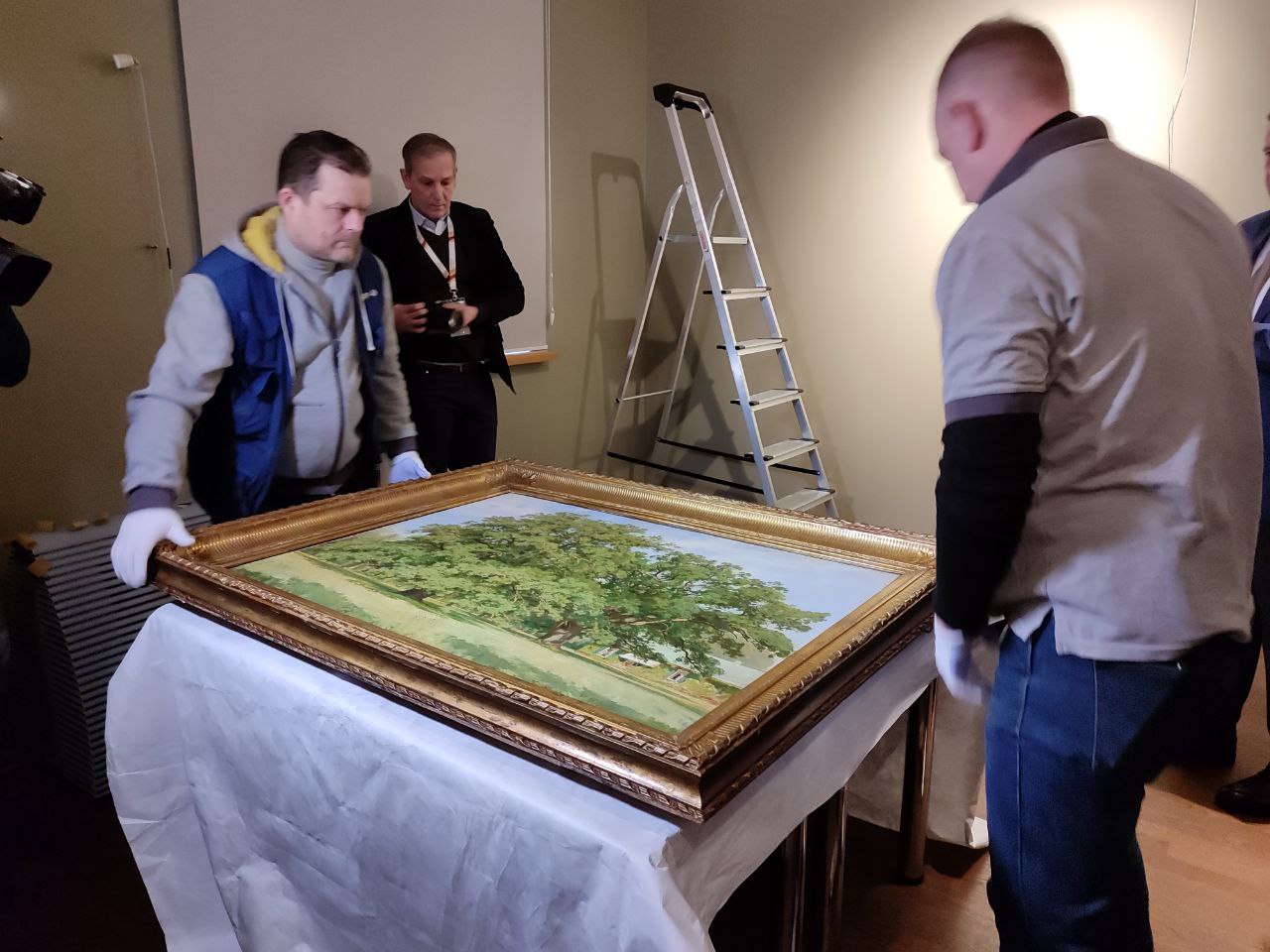 Снятие первой картины Шишкина прошло в торжественной обстановке. В первую очередь, после снятия эксперт-реставратор оценил состояние картины, она должна быть в точно таком же виде, в каком и приехала в музей. После его одобрения полотно было тщательно упаковано, а в коридоре его уже ждал специальный короб, в котором будет проводиться транспортировка.