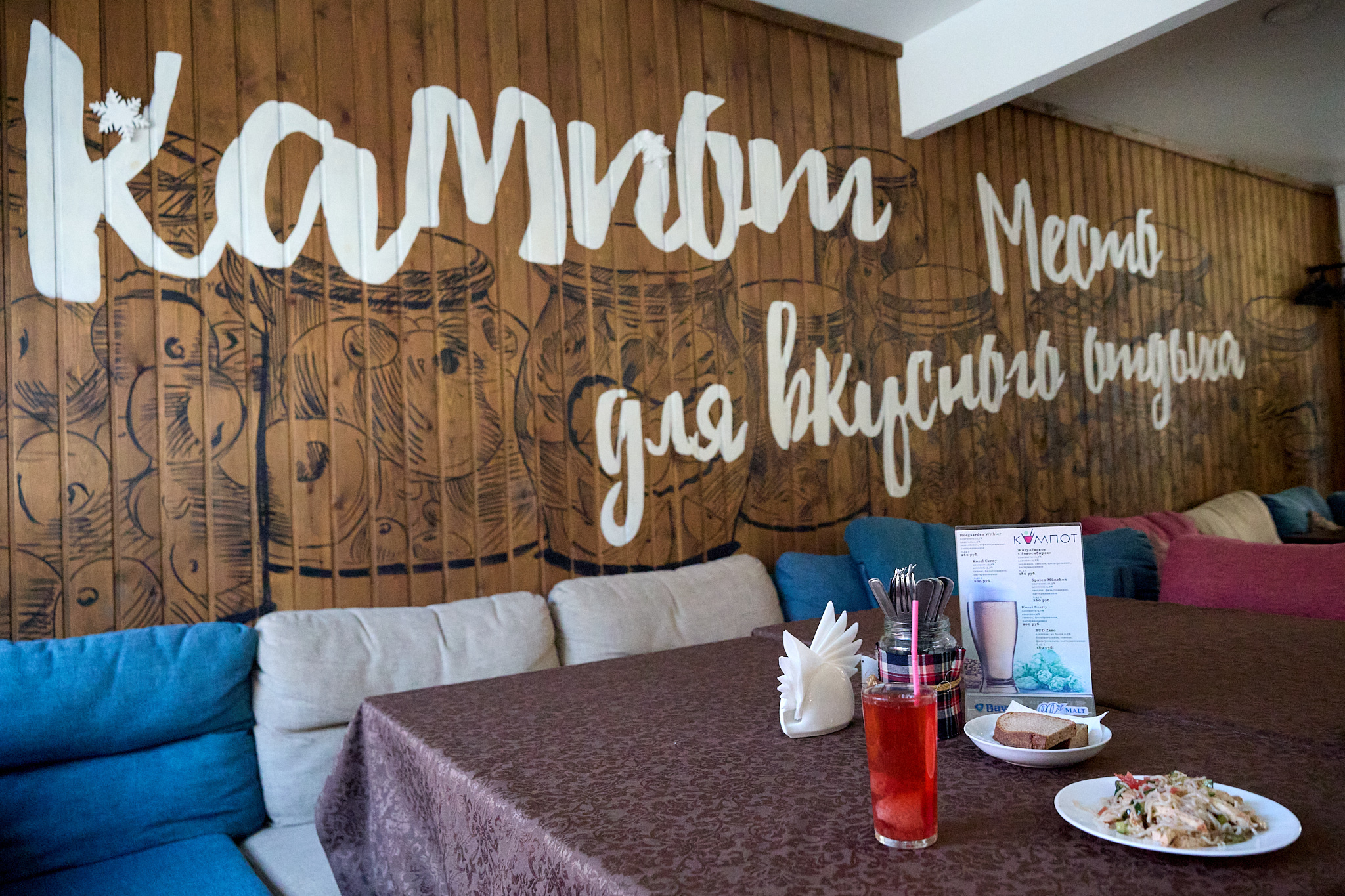 Зайдя, сразу с порога понимаешь: заведение не из категории фешенебельных, а что-то между «старое доброе» и «видавшее виды». В таких местах так и видишь, как при создании интерьера руководствовались инструкцией «сделать, чтобы было уютненько». Здесь для этого и большой книжный стеллаж с разнообразной литературой, настольными играми, на полочках стоят всевозможные баночки с компотом и домашними вареньями и маринадами, фигурки, статуэтки, чайнички. На стенах сочные рисунки ягод и фруктов. В целом есть ощущение, что ты словно спустился в домашний погреб, на некоторых стенах в подтверждение этому даже оформлена имитация кирпичной кладки. На потолке еще одна интересная деталь — деревянное панно с подсветкой, тема древа продолжается и на одной из стен в виде панелей, на которых красуется слоган «Кампот — место для вкусного отдыха».