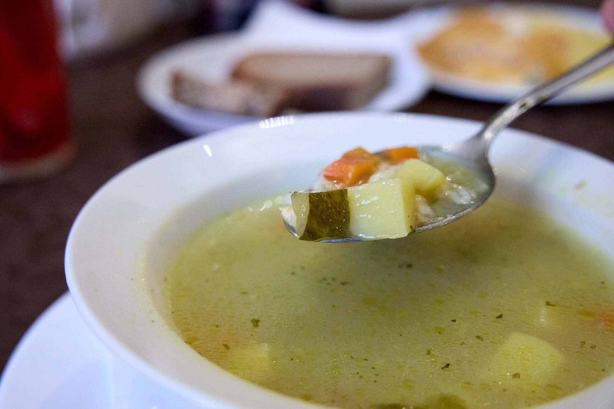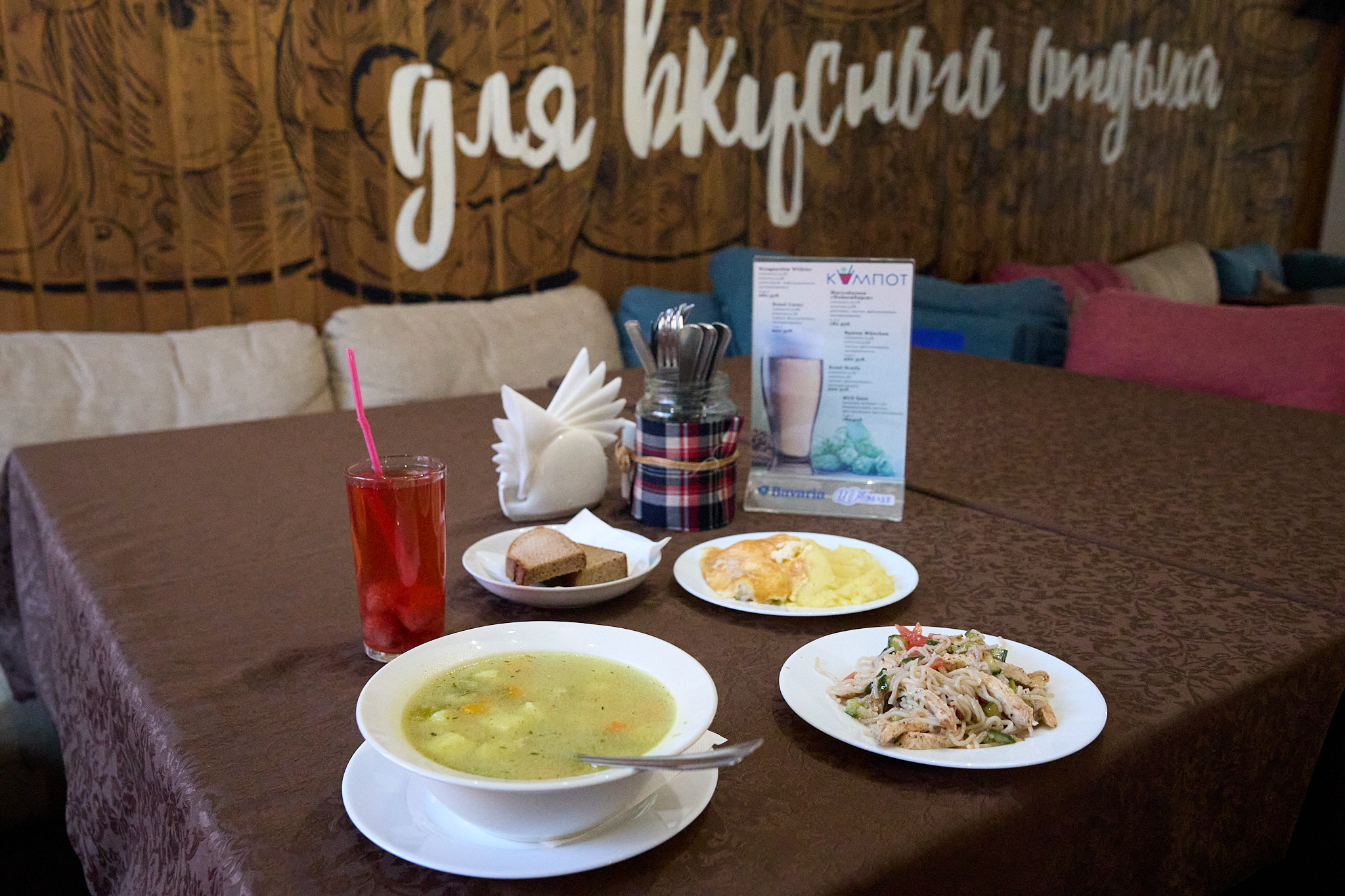 На столе, застеленном скатертью, уже стояли приборы в стеклянной банке, поддерживающей концепцию домашних закруток и погреба, салфетки, соль, перец и даже зубочистки, что как ни странно, но не везде встретишь. К скорости подачи блюд вопросов нет — выносили быстро и в верной последовательности. Буквально 7-10 минут, и на столе уже красовался наш полноценный обед, к которому нам как раз и пора перейти.