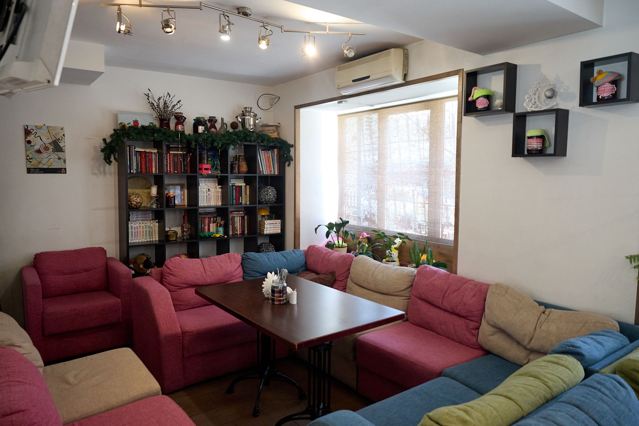 Но ключевое внимание, на наш взгляд, приковывают разноцветные диваны с подушками — широкие, мягкие, заменяют абсолютно все стулья в кафе и к тому же крайне вместительные. Где-то потертые, где-то с прожженной дыркой, но очень мягкие. Обеденные столы расположились вдоль стен под большими окнами, выходящими с одной стороны на неприглядный двор, а с другой — на дорогу и кусочек начала набережной.