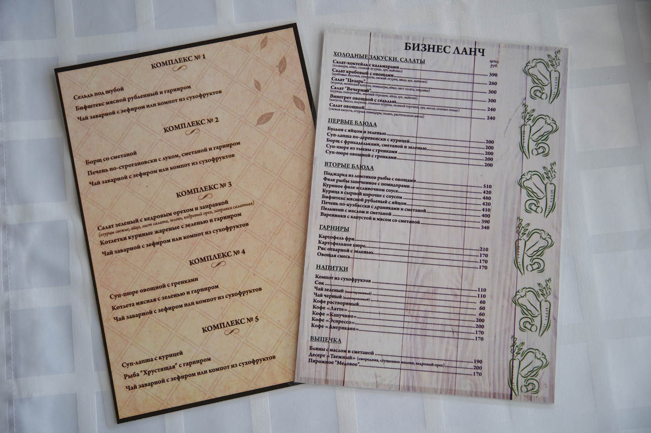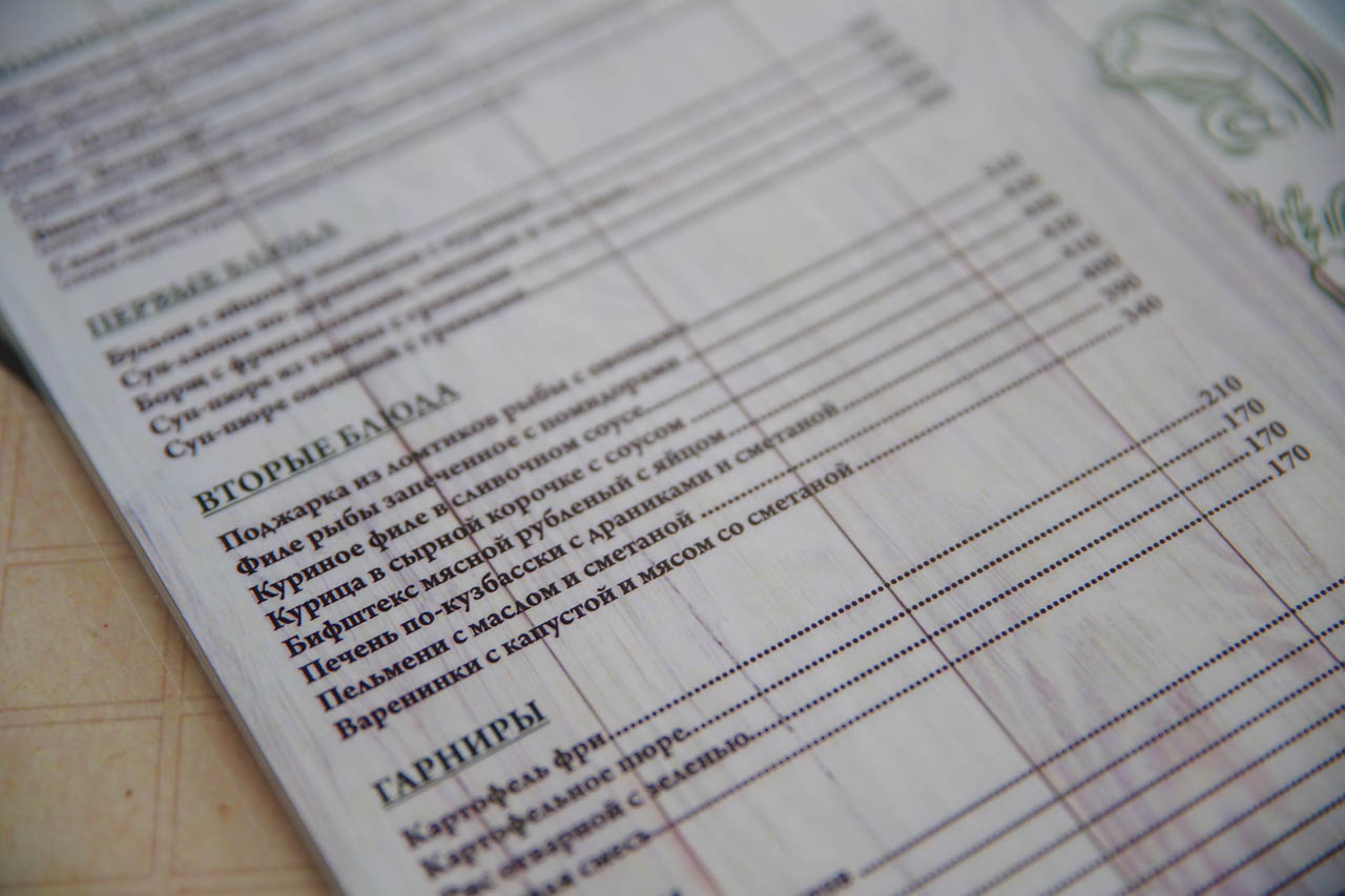 Цены в другом меню — выше ожидаемого. Наш обед из горячего и напитка обошелся нам в 450 рублей. Да, это ресторан, а не забегаловка, но и это не вечерний ужин, а обед, на котором ожидаешь увидеть более приятную стоимость.