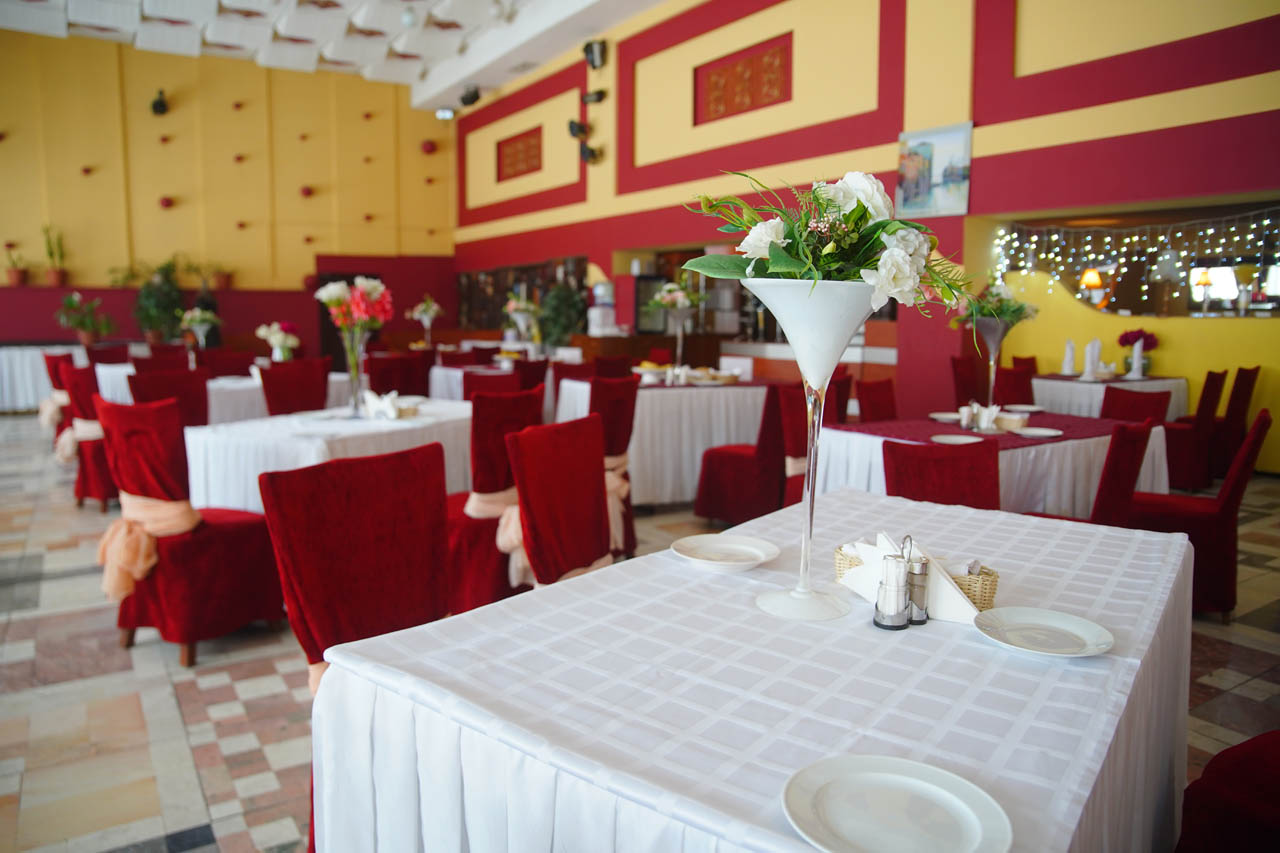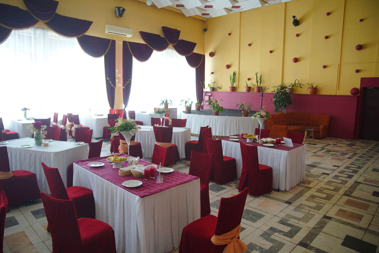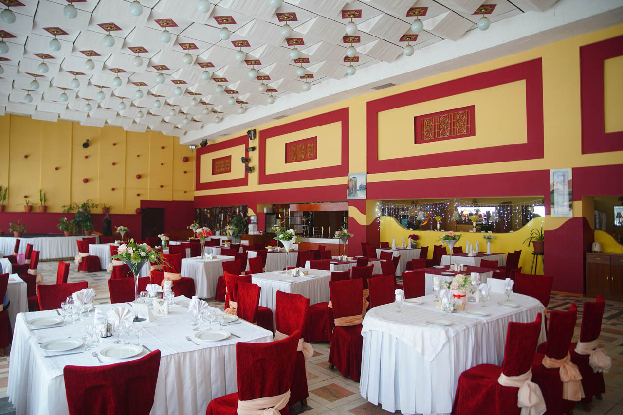 Первое впечатление при входе в зал ресторана такое, словно мы попали на торжество, где пока еще нет гостей, но зал уже «нафуфырен», другого слова не придумаешь. Это, что называется, «роскошный максимум» банкетного зала из 90-х или нулевых годов. Огромный зал, высокие потолки, широкие панорамные окна, завешанные белоснежным тюлем и тяжелыми бордовыми бархатными портьерами с золотистой бахромой. Стены выкрашены в не самый аппетитный оттенок желтого и бордового. А на потолках сохранился узнаваемый советский декор. Местами на стенах висят совсем неуместные картины с венецианскими пейзажами, где-то переливается небольшая гирлянда.