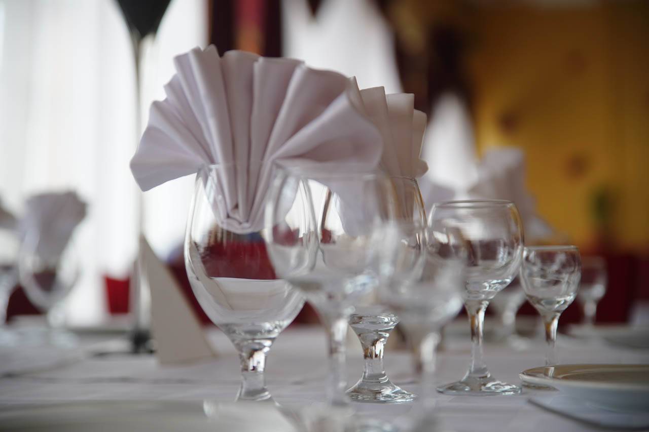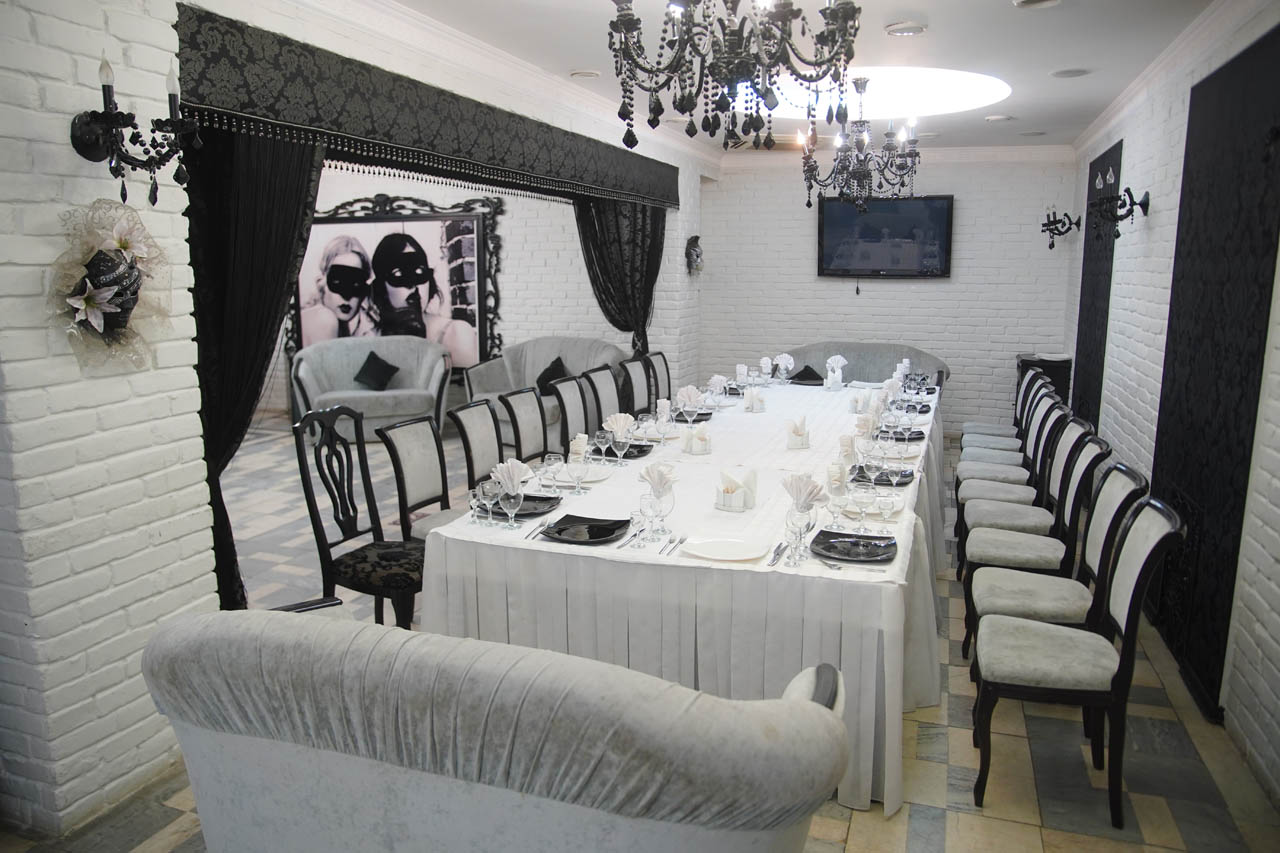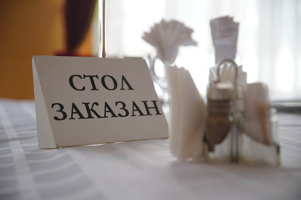 Первое впечатление при входе в зал ресторана такое, словно мы попали на торжество, где пока еще нет гостей, но зал уже «нафуфырен», другого слова не придумаешь. Это, что называется, «роскошный максимум» банкетного зала из 90-х или нулевых годов. Огромный зал, высокие потолки, широкие панорамные окна, завешанные белоснежным тюлем и тяжелыми бордовыми бархатными портьерами с золотистой бахромой. Стены выкрашены в не самый аппетитный оттенок желтого и бордового. А на потолках сохранился узнаваемый советский декор. Местами на стенах висят совсем неуместные картины с венецианскими пейзажами, где-то переливается небольшая гирлянда.