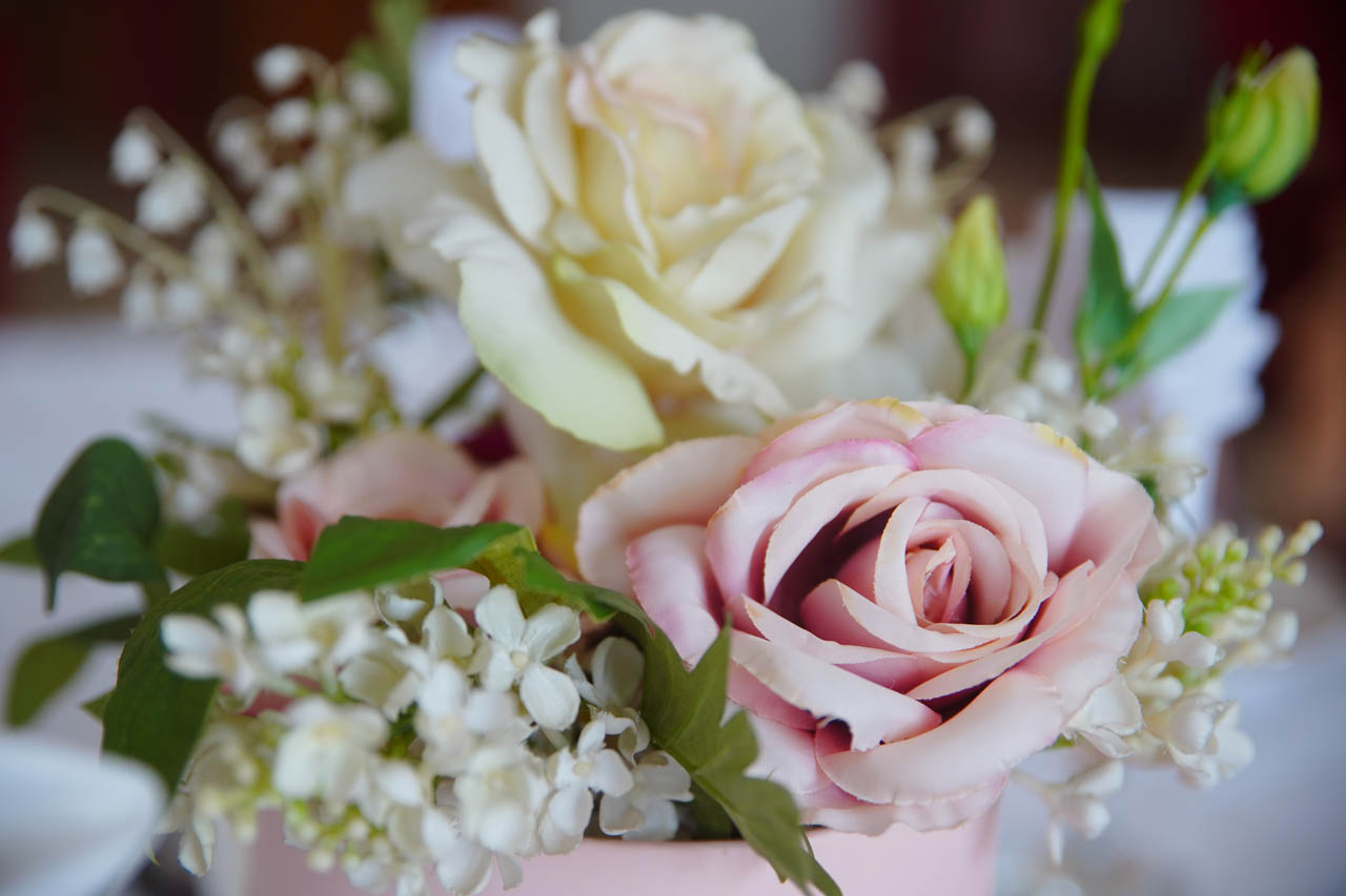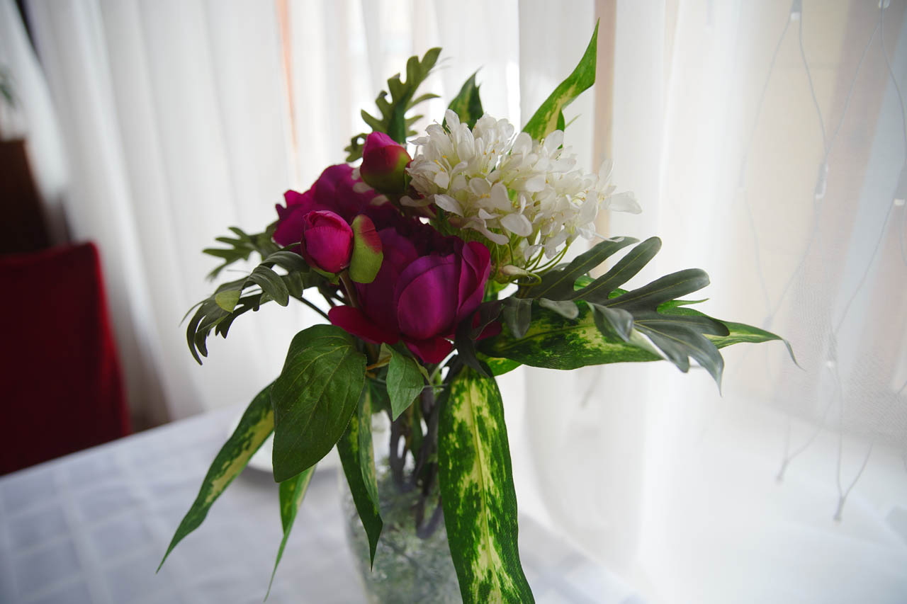 Все столики застелены белой сатиновой скатертью и сервированы посудой, приборами и довольно роскошными композициями, правда, из искусственных цветов. Живых растений в горшках здесь, к слову, также много. Стулья задрапированы вельветом и перевязаны огромными бантами из фатина, правда, такая роскошь, однако, досталась не всем стульям. И сервировка на всех столах абсолютно разная. Выбранный нами столик был, например, в крошках — тоже часть декора?