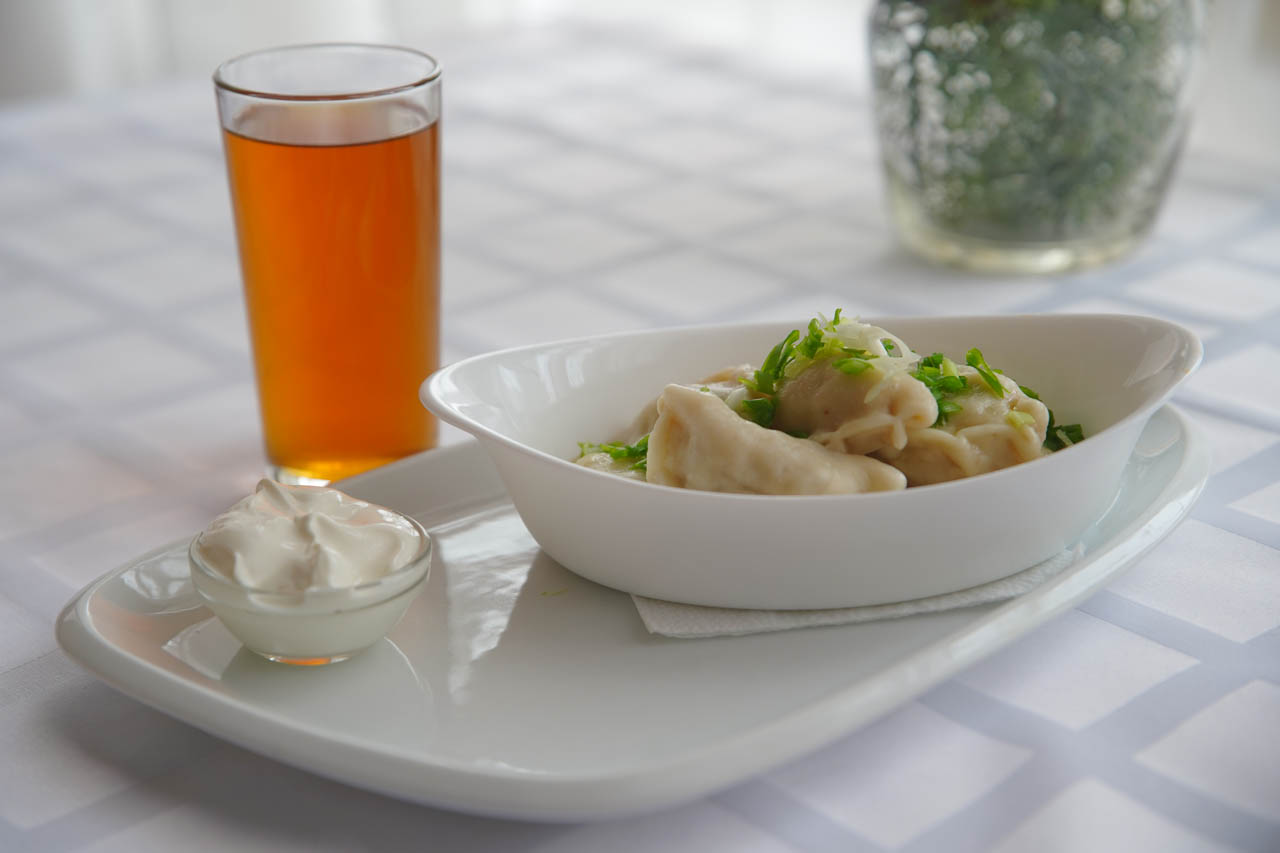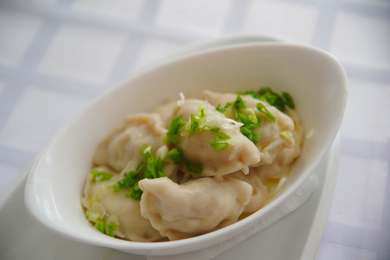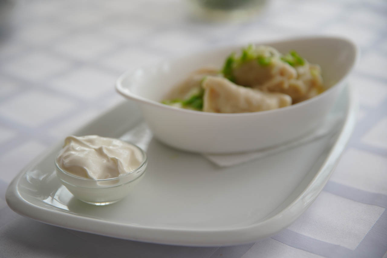 И вот нам выносят тарелочку с горяченькими варениками, ставят на стол вместе со сметанкой. По краям растекается сливочное масло, сверху все это великолепие посыпано свежим зеленым лучком. Красотища. Вареники большие, слепленные руками, это видно. Пробуем — вкусно, но присутствует ощущение сырого теста. А возникло оно из-за того, что этого теста очень много, и, возможно, оно просто не проварилось окончательно. Обилие оного же забирает на себя внимание от начинки, в которой чувствуется вкусная капустка и немного мяса. Наш фотограф, кстати, отметил неприятное обилие лука — он был и в начинке, и в качестве декора, от которого было сложно избавиться.