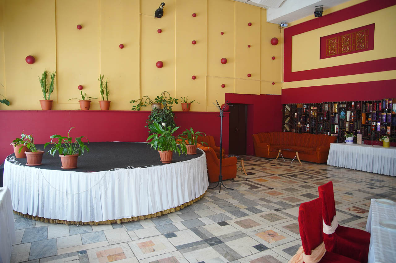 Очевидно, что основная функция у ресторана — это банкеты. Для этого здесь есть сцена, большие колонки, на стене висят прожекторы и стробоскопы. Не хватало только дискошара. На фоне играло радио, с другого угла доносились звуки телевизора, который смотрели сотрудники в своей зоне, а высокие потолки эхом разносили по залу беседу двух дам, тоже сидевших в ресторане.