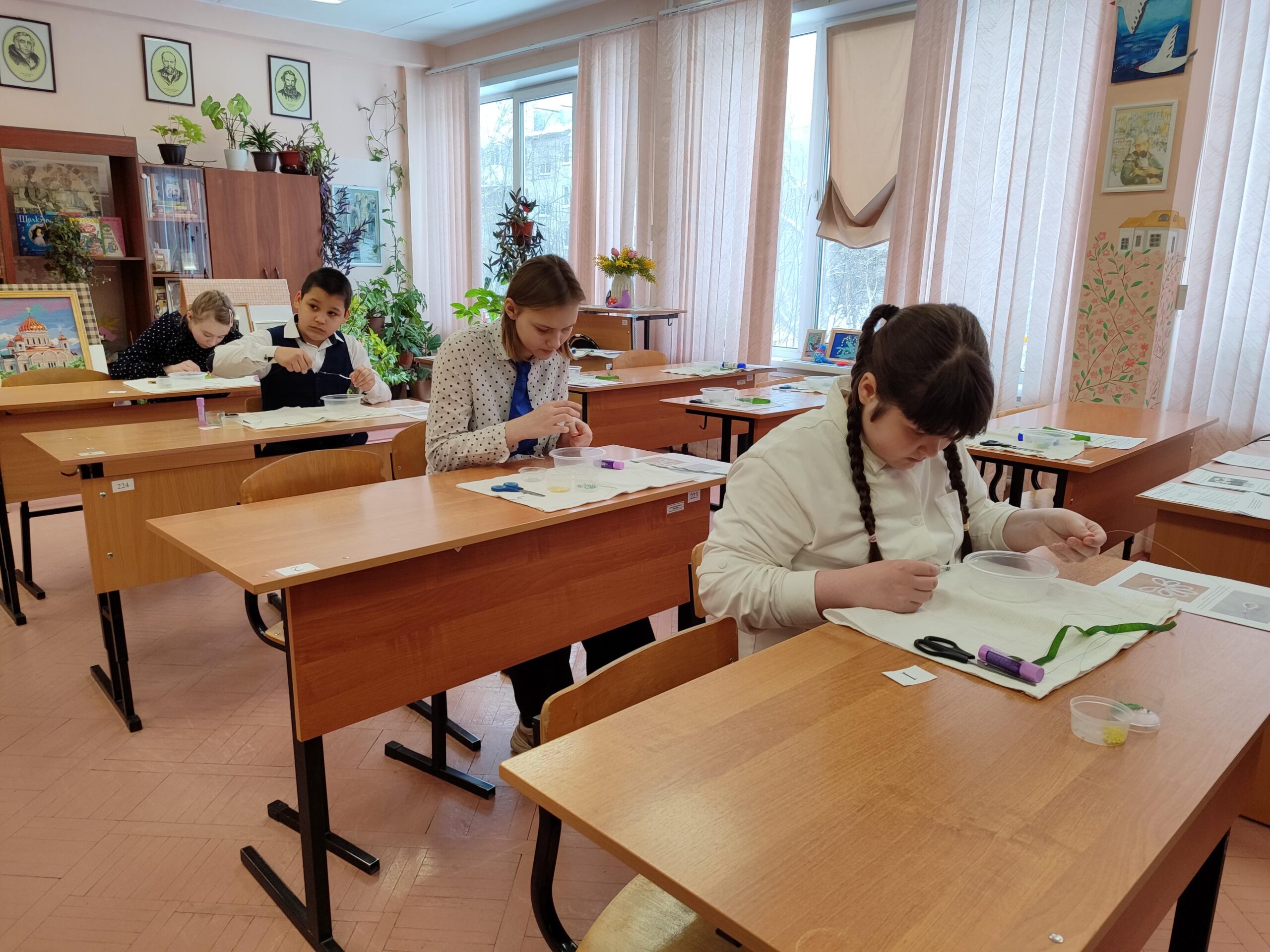 Компетенция работы по дереву предполагала изготовление рамки, флористика – создание декоративного венка из веток и сухоцветов. А в парикмахерском деле – не просто сделать прическу на волосах, но и самостоятельно изготовить украшение для волос. Участницы выбрали разные варианты – сделать из лент, сплести из бисера или смастерить из фольги. Одой из самых популярных по числу участников стала компетенция «Художественное слово» – ребята читали отрывки из известных произведений, отыгрывали роли и читали стихи.
