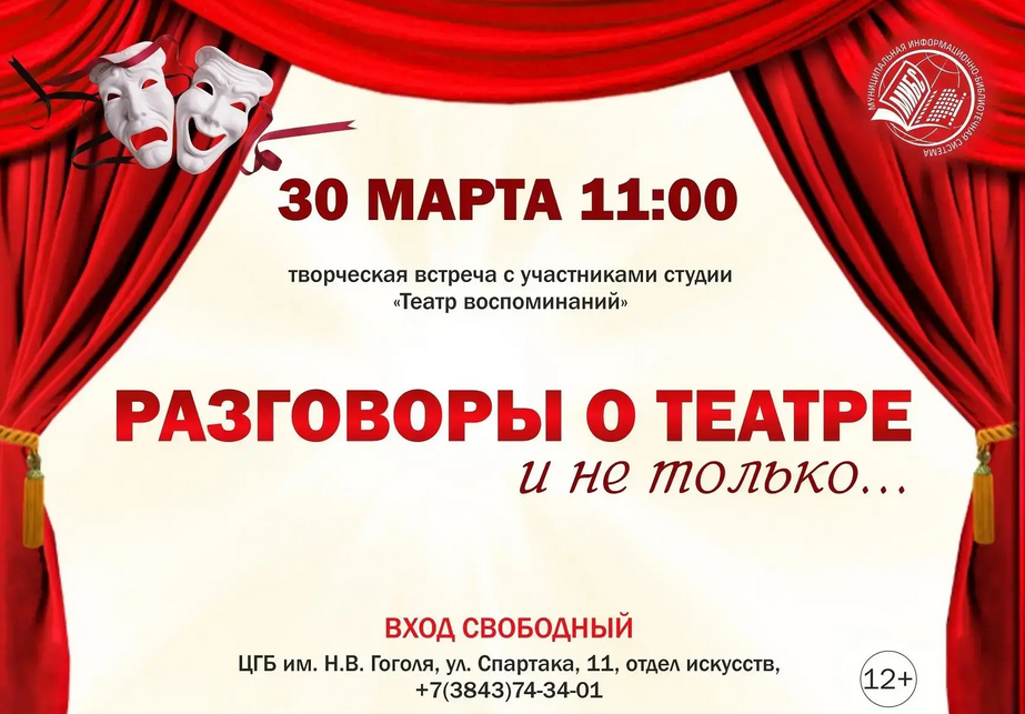 А вот Центральная городская библиотека им. Н.В. Гоголя 30 марта в 11:00 устраивает творческую встречу с участниками студии «Театр воспоминаний», где гости узнают о первых шагах создания творческого объединения и познакомятся с некоторыми актерами. Вход свободный. 12+