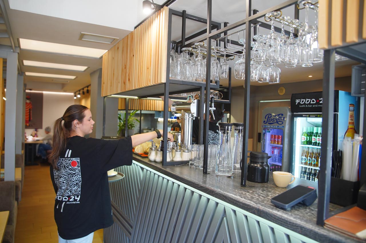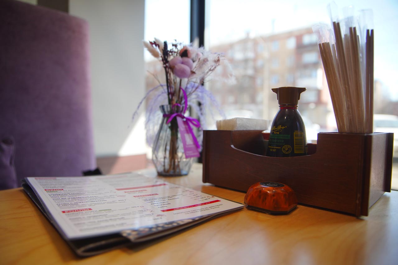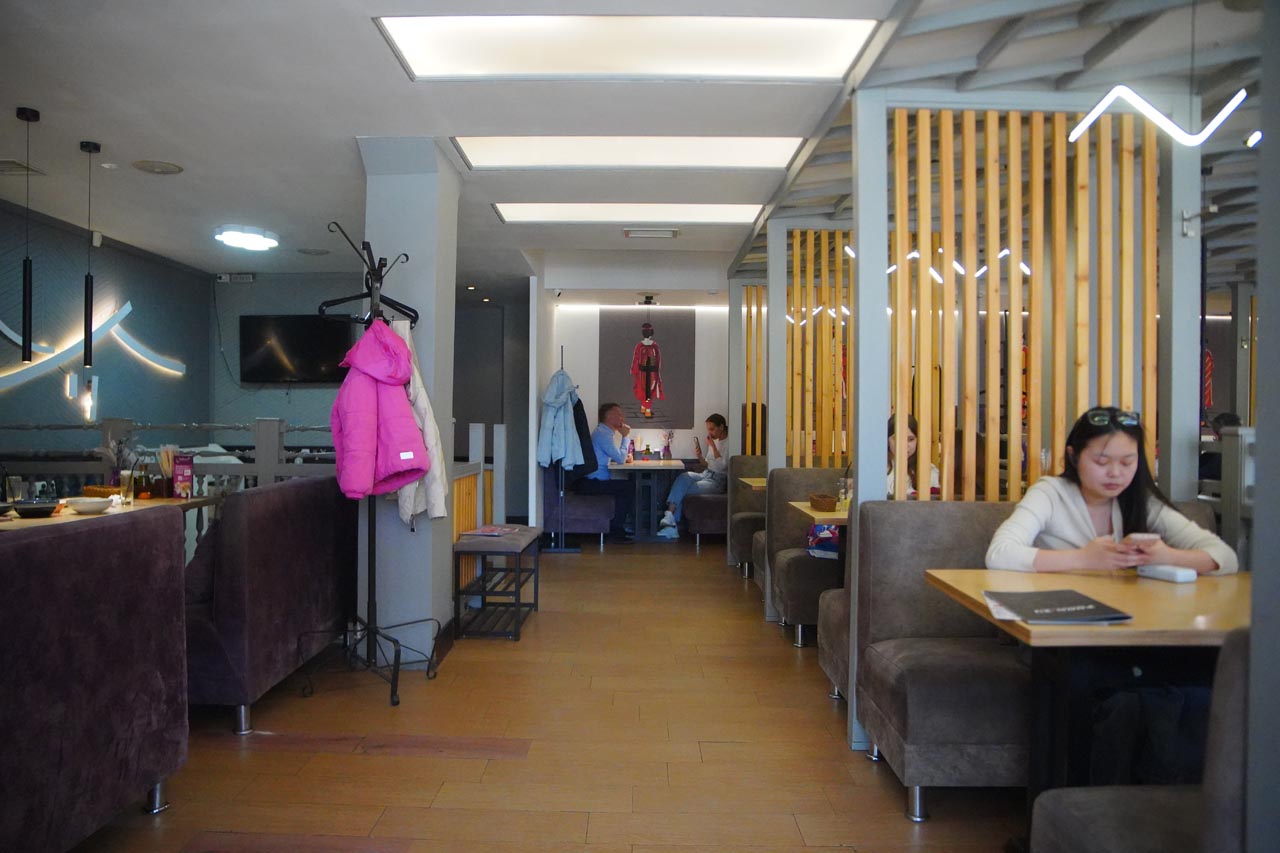 Описывать интерьер интересно, когда в нем есть откровенные недостатки или же яркие акценты. В случае «Фудзи» говорить особо не о чем: здесь светло, в меру просторно и чисто. По всему залу довольно плотно расставлены столы с диванчиками. Их близкое расположение компенсируют реечные перегородки, они создают более комфортную обстановку, огораживает от посторонних глаз. Ну и плюс разбавляет нейтрально-серые цвета интерьера. В дальнейшем мы ещё не раз скажем о нейтральности, так что запоминаем этот момент.