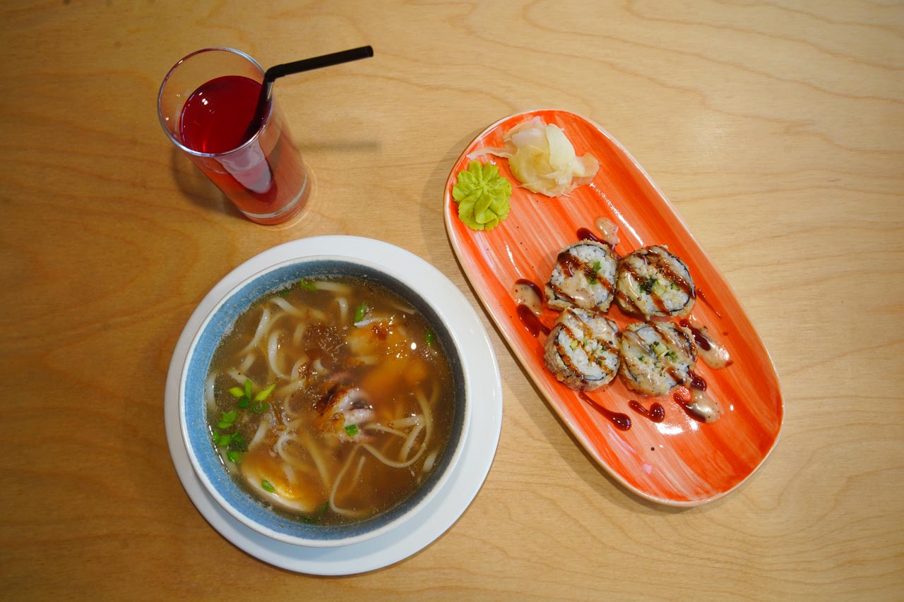 На первое мы заказали рамен с морепродуктами и удоном, на второе — роллы темпура унаги (неужели вы могли подумать, что мы обойдёмся без них?) и клюквенный морс.