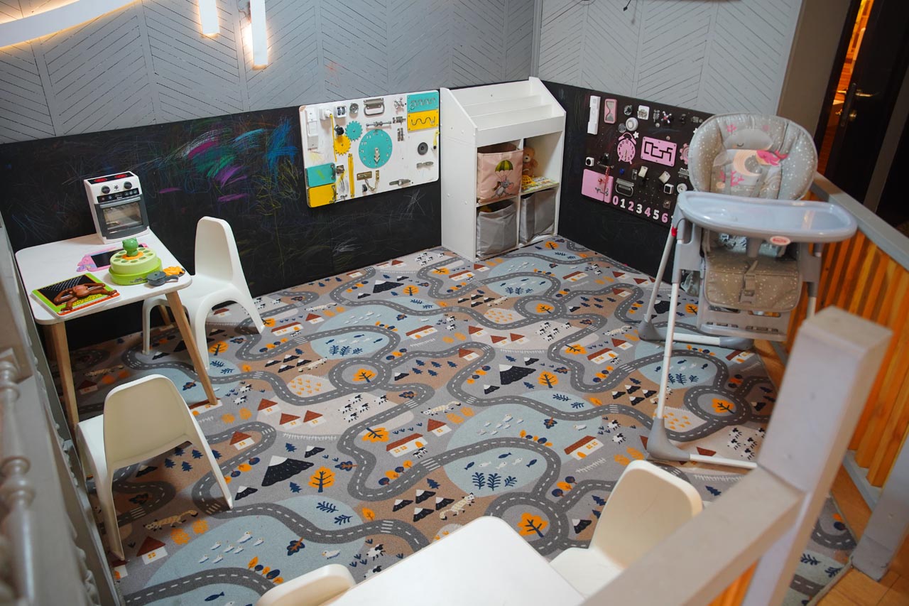 Ещё одна примечательная деталь — это детский уголок. Из четырех заведений, в которых мы уже были, пока это первое, в котором мы заметили отдельную зону для детей. Она огорожена высоким заборчиком, здесь уложен ковер, есть различные игрушки, доски Монтессори и столик для кормления малышей.