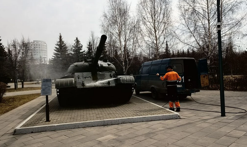В Новокузнецке в Музее военной техники под открытым небом, который находится в сквере маршала Жукова, провели генеральную уборку – помыли экспонаты. Так специалисты Муниципального трамвайно-троллейбусного предприятия делают ежегодно в преддверии празднования Дня Победы.