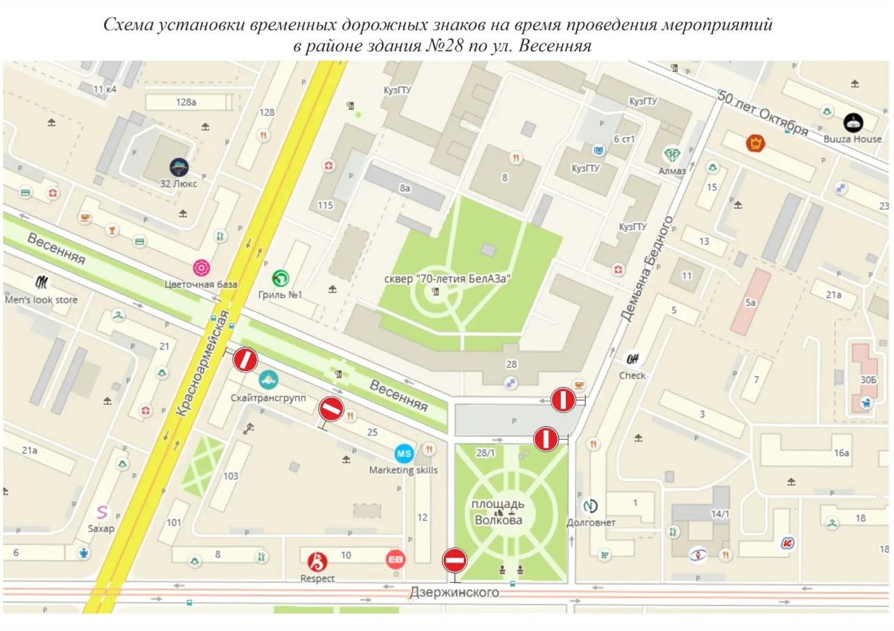 Так, с 20:00 28 апреля до 14:30 29 апреля будет запрещена стоянка транспорта у здания №28 по ул. Весенняя и по периметру площади Волкова. С 7:00 до 14:30 29 апреля также будет запрещен проезд по Весенней от Красноармейской до Демьяна Бедного, по дороге вдоль площади Волкова и на парковке у главного корпуса КузГТУ.