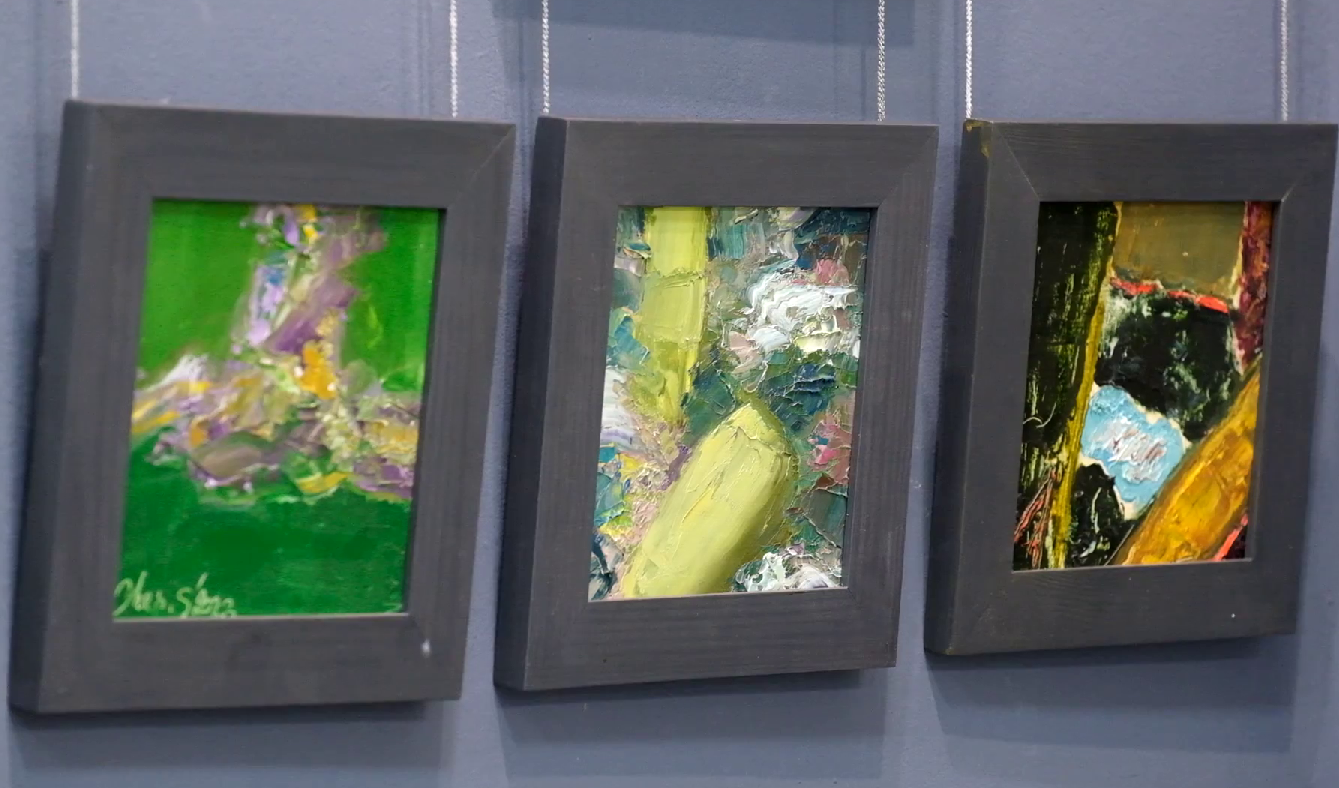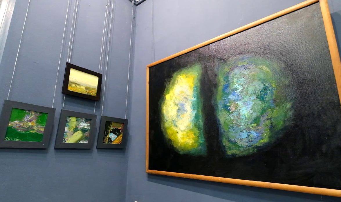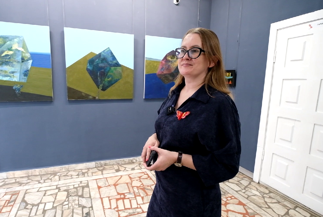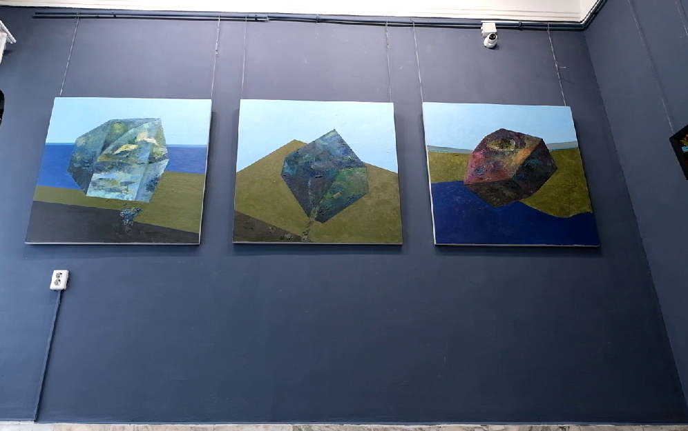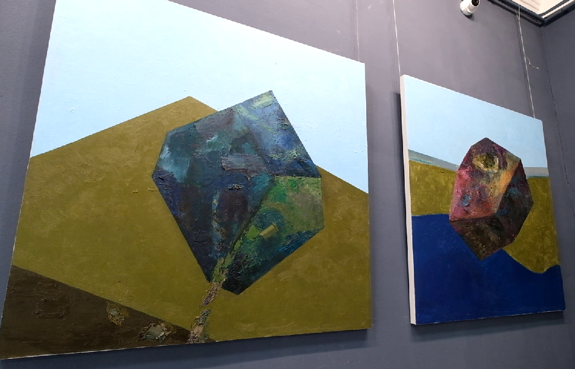 Отдельную стену занял ее триптих «Камни». Как призналась художница, для нее характерна высокая скорость создания работ, а вот эти картины создавались долго, причем то откладывались, то снова брались в работу. И в принципе, эти четкие линии, острые углы, жесткие формы совсем не свойственны произведениям Екатерины. Но она хотела изобразить эти камни, которые то ли падают, то ли взлетают, но точно находятся в движении. Главное, что эта динамика нравится самому автору.
